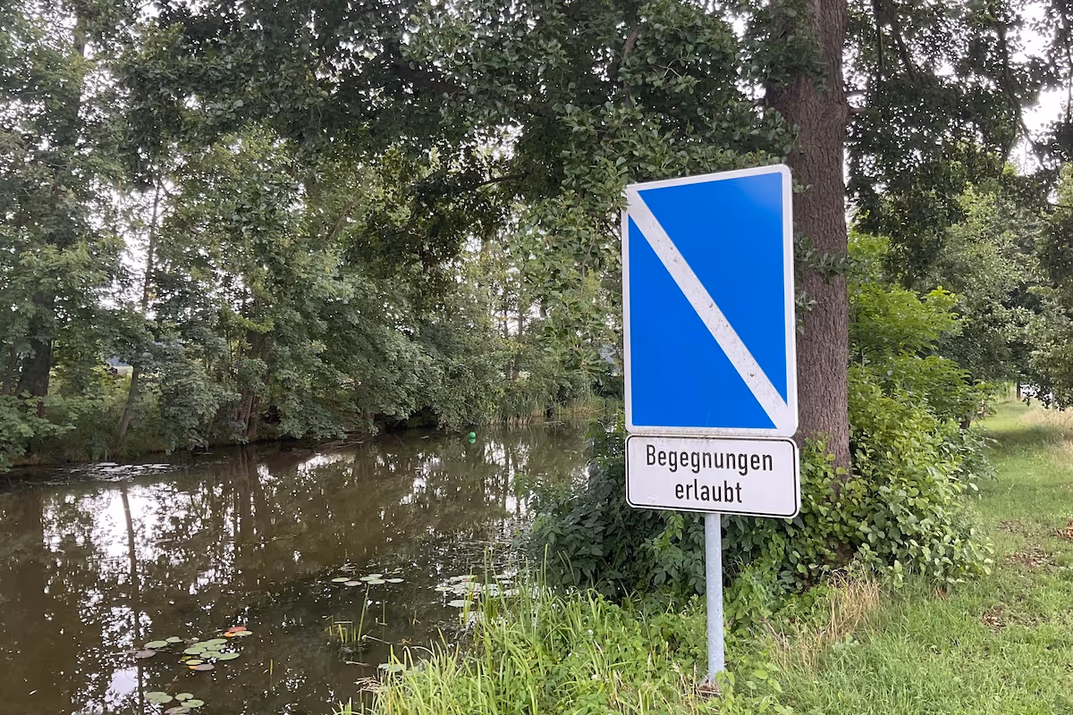 Dieses Schild steht am Kanal in Zerpenschleuse. Findet es und stellt seine Botschaft in einer Szene dar.